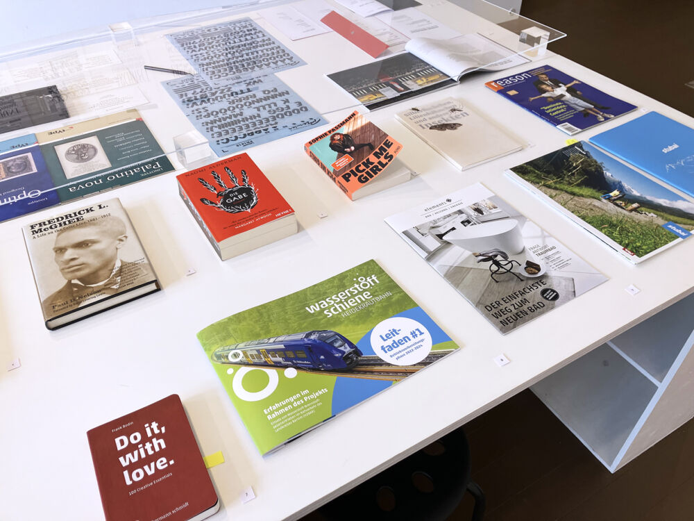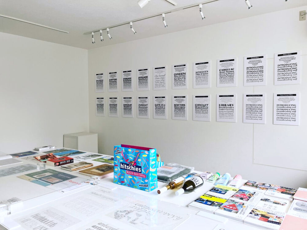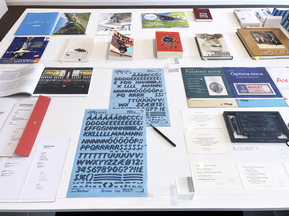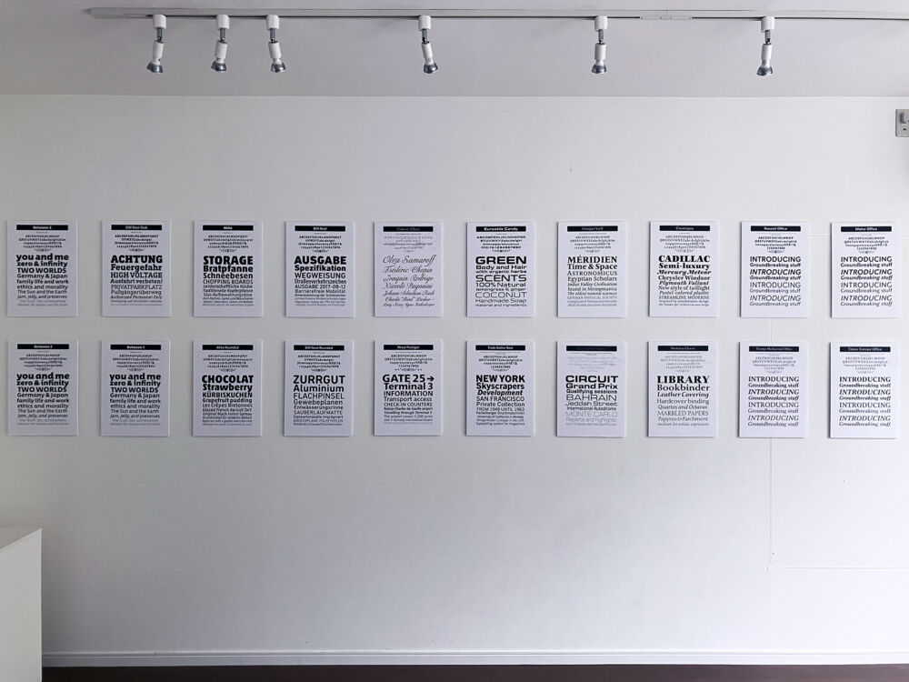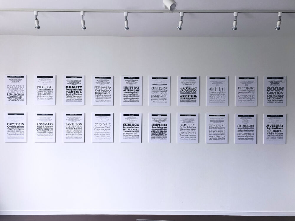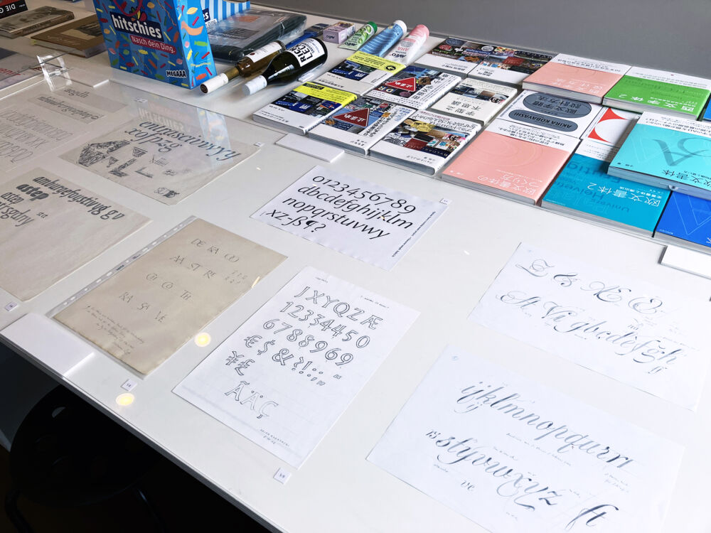 展示物: ・欧文書体40書体(壁面)+AKルネサンスPb(卓上) ・FF Cliffordなどスケッチ13点 ・欧文書体が使われている書籍やプロダクト22点 ・著書(日本、台湾、中国、韓国版)